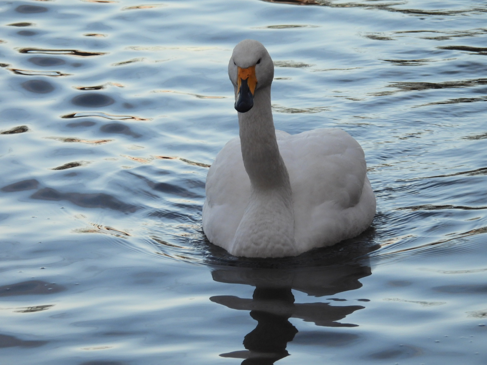 首が曲がっているオオハクチョウさんが泳いでいました。Duck4は見た途端、カーブちゃんと思いました。