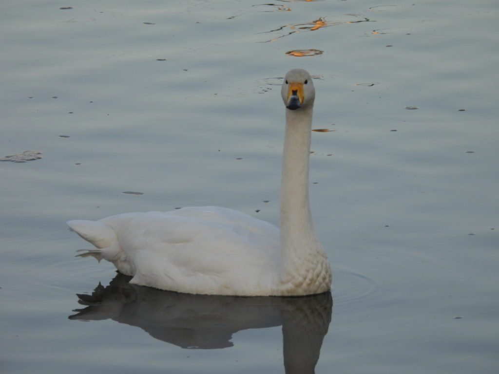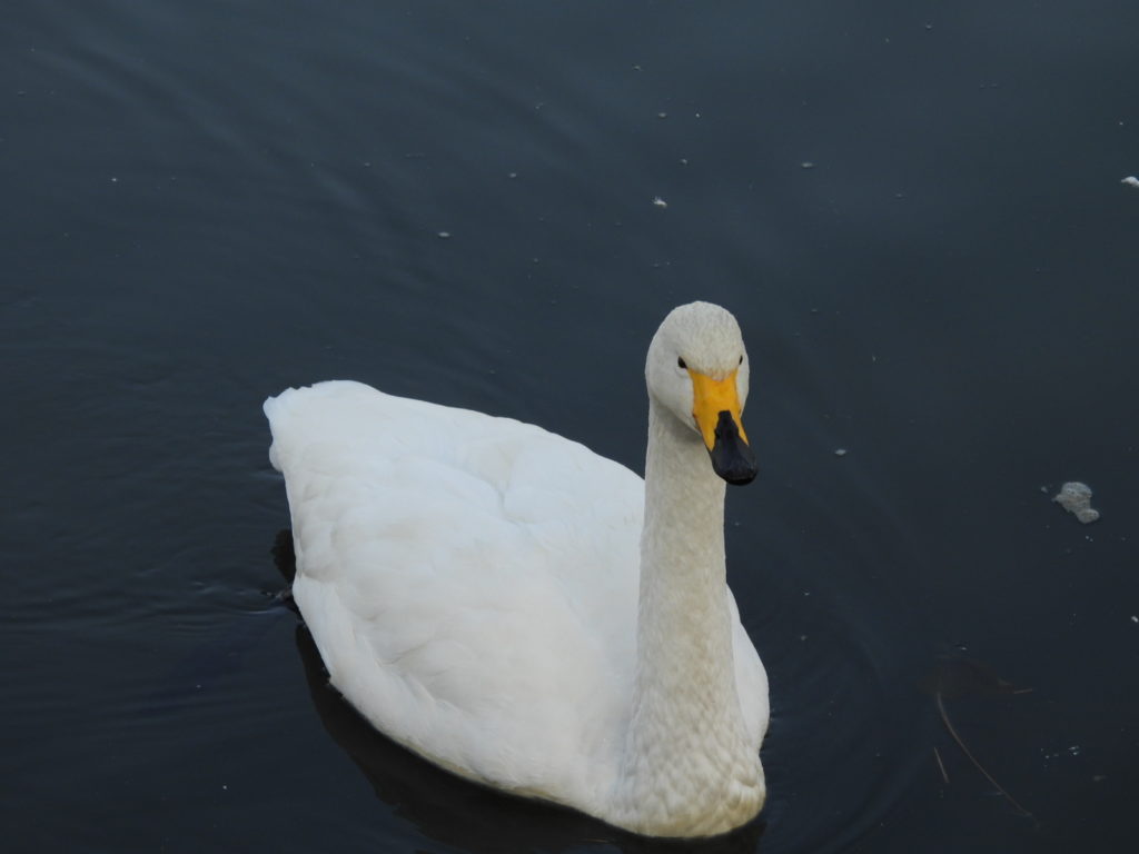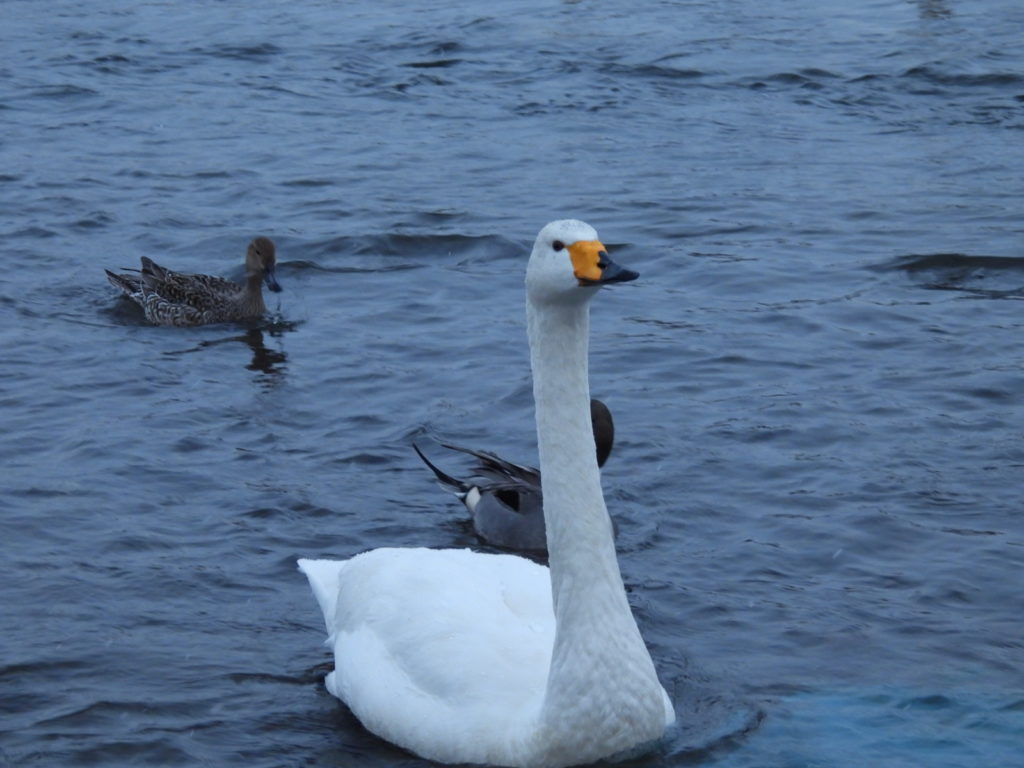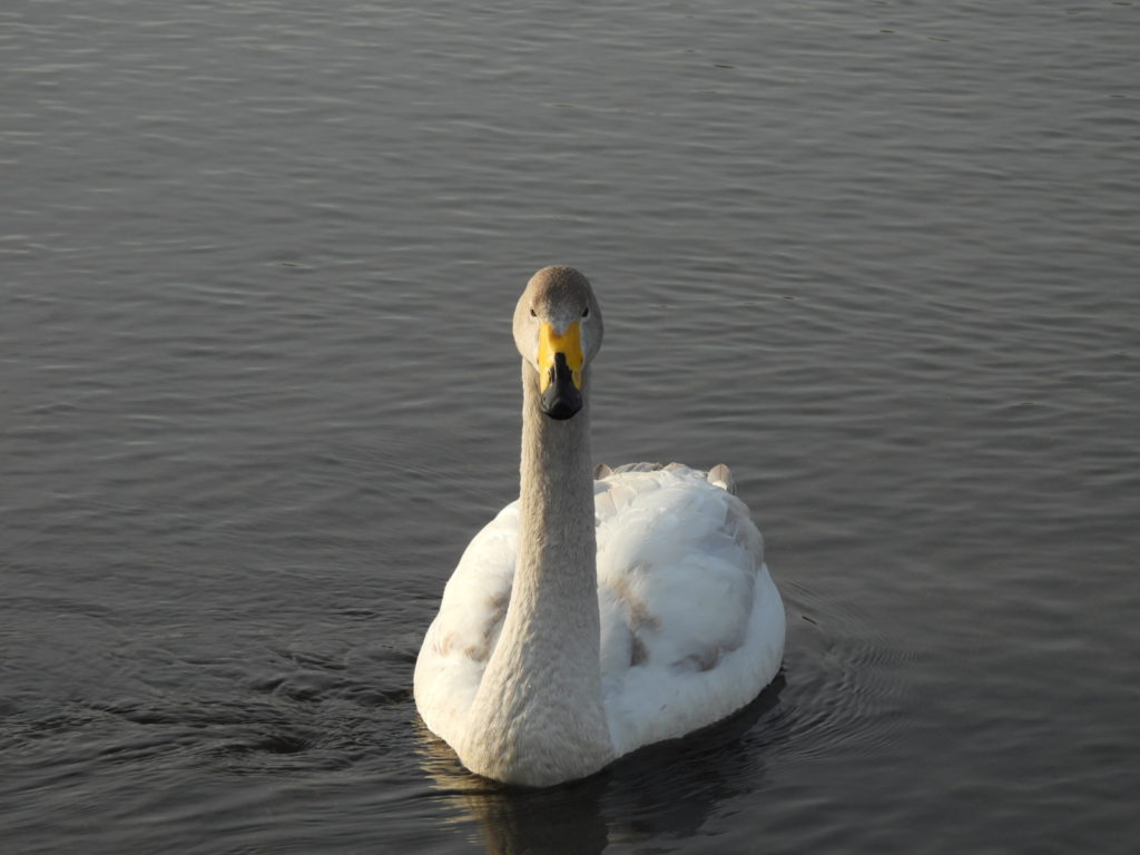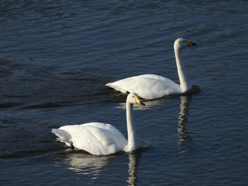 そして、しばらく2羽の様子を見ていると、右側に尾っぽが曲がっているオオハクチョウさんともう1羽が一緒に泳いでいました。遠くからの撮影だったので、わかりませんでしたが、もしかしたらもしかすると、ライトちゃん夫妻ではないかと思いました。