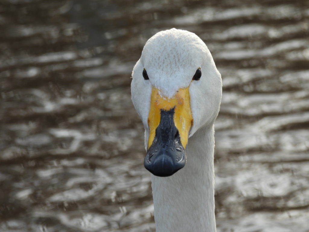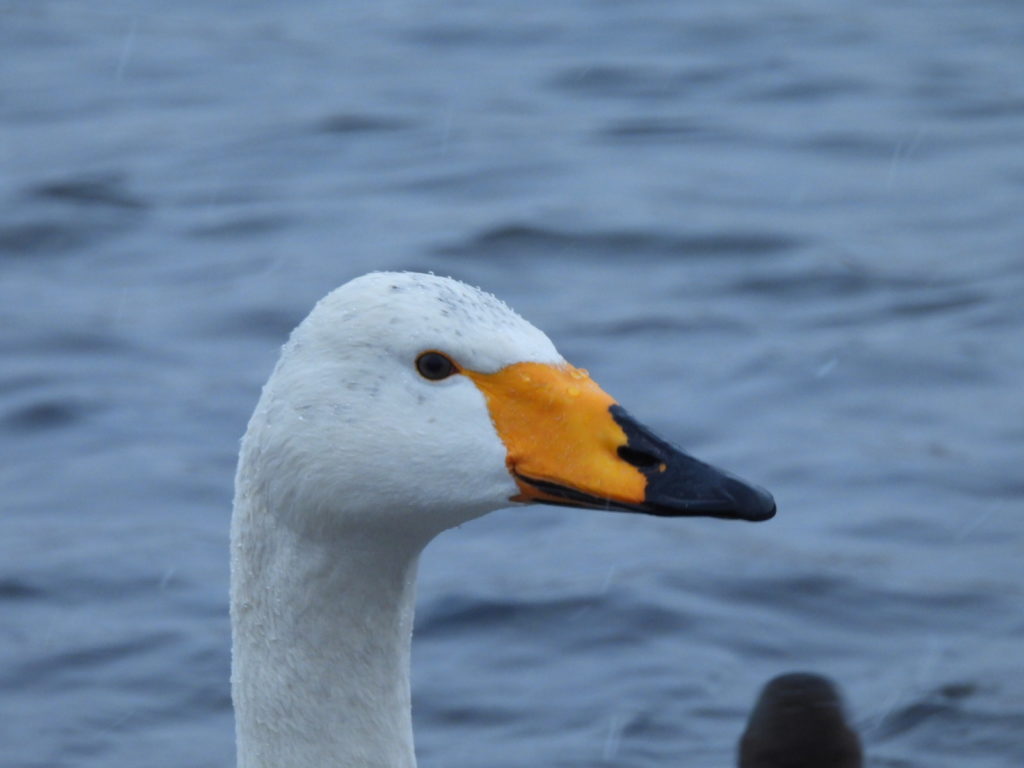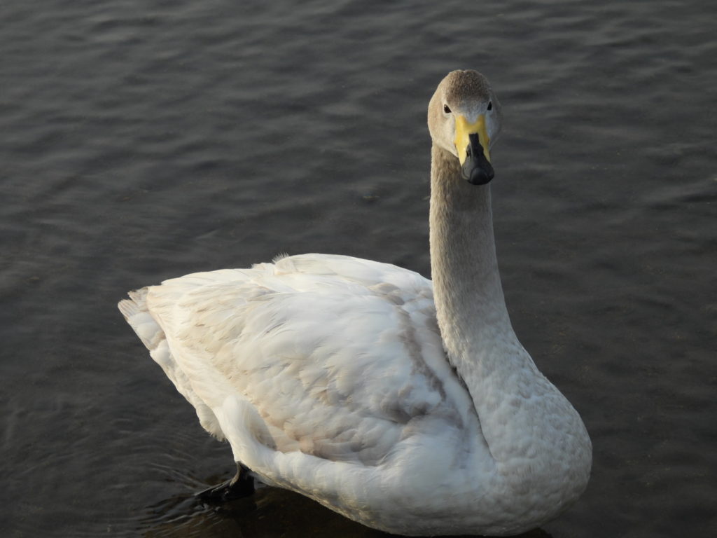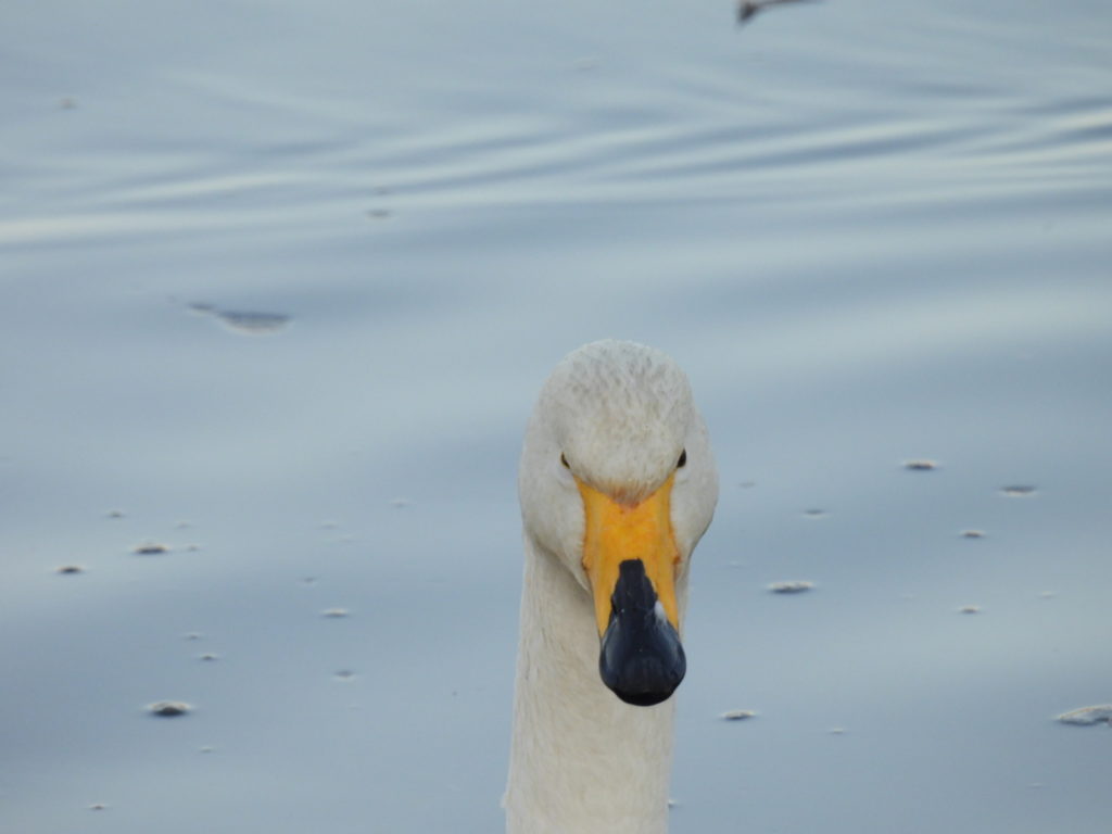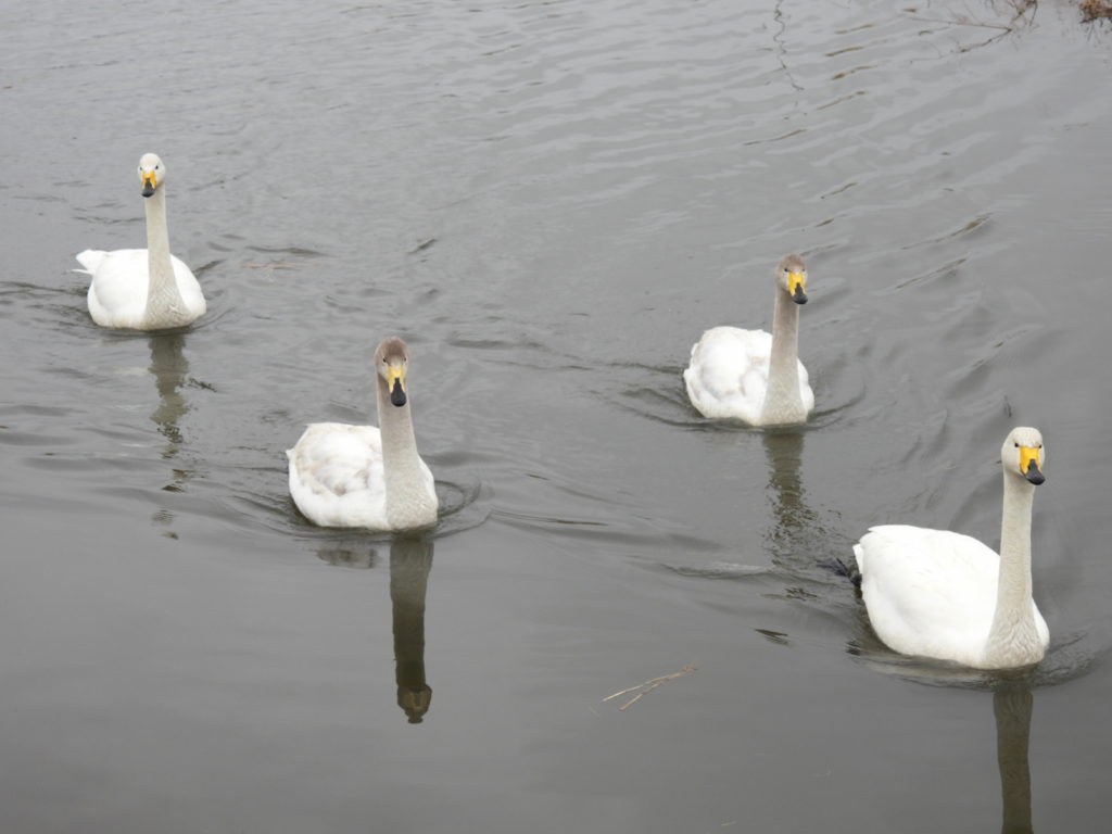 そして、しばらく2羽の様子を見ていると、右側に尾っぽが曲がっているオオハクチョウさんともう1羽が一緒に泳いでいました。遠くからの撮影だったので、わかりませんでしたが、もしかしたらもしかすると、ライトちゃん夫妻ではないかと思いました。