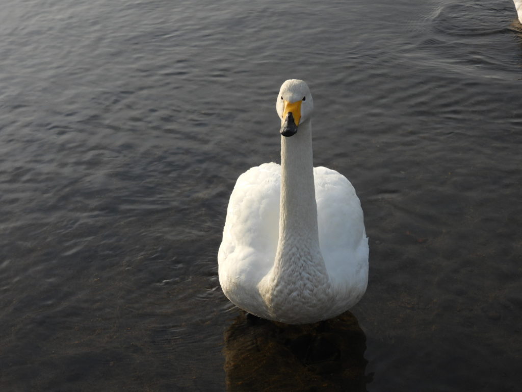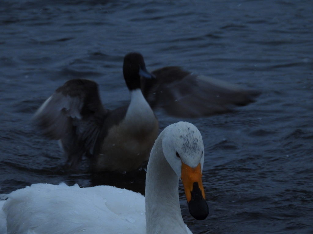ところで、下流には70羽以上のハクチョウさんがいました。その中には、アドちゃんとロクちゃん2世。ライトちゃん夫妻。首が曲がっているオオハクチョウさん。迷子の幼鳥オオハクチョウさんも待っていました。帰りに立ち寄ると、アドちゃんとロクちゃん2世はDuck4のところに近づいて来ました。そして、「ク!ク!」とアドちゃんはDuck4に鳴いて話しかけてきました。