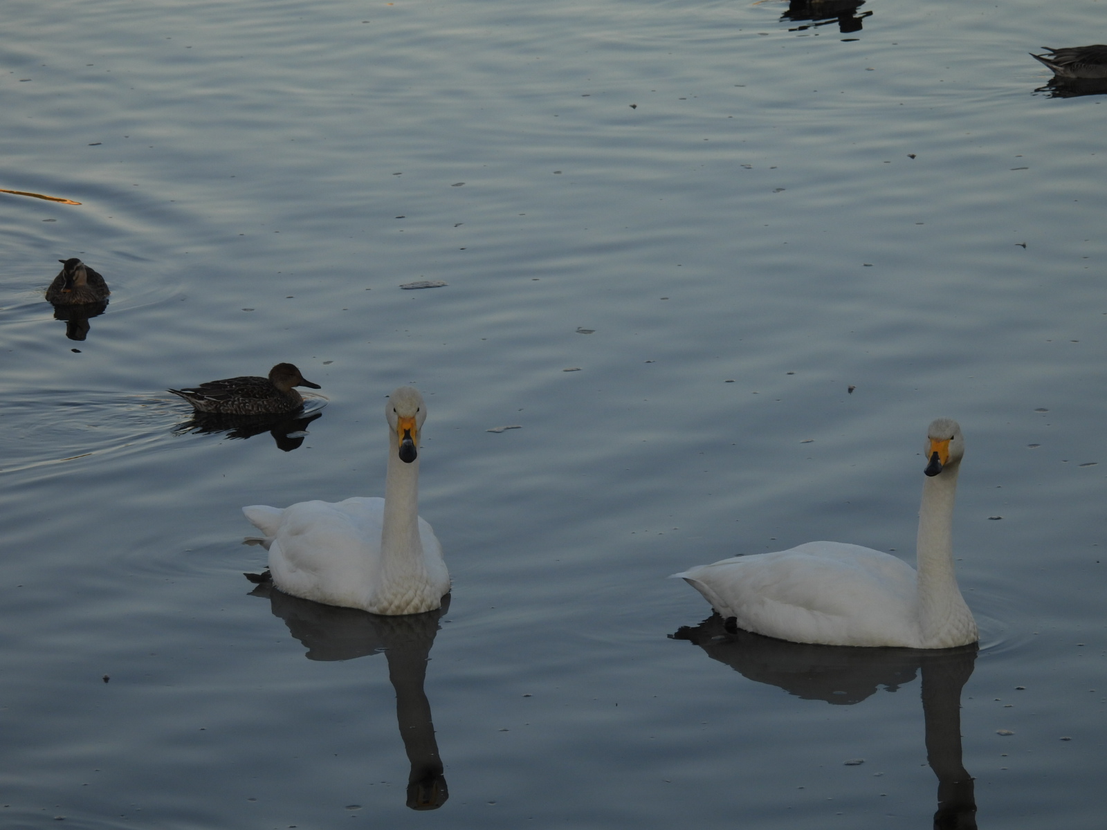そして、しばらく2羽の様子を見ていると、右側に尾っぽが曲がっているオオハクチョウさんともう1羽が一緒に泳いでいました。遠くからの撮影だったので、わかりませんでしたが、もしかしたらもしかすると、ライトちゃん夫妻ではないかと思いました。